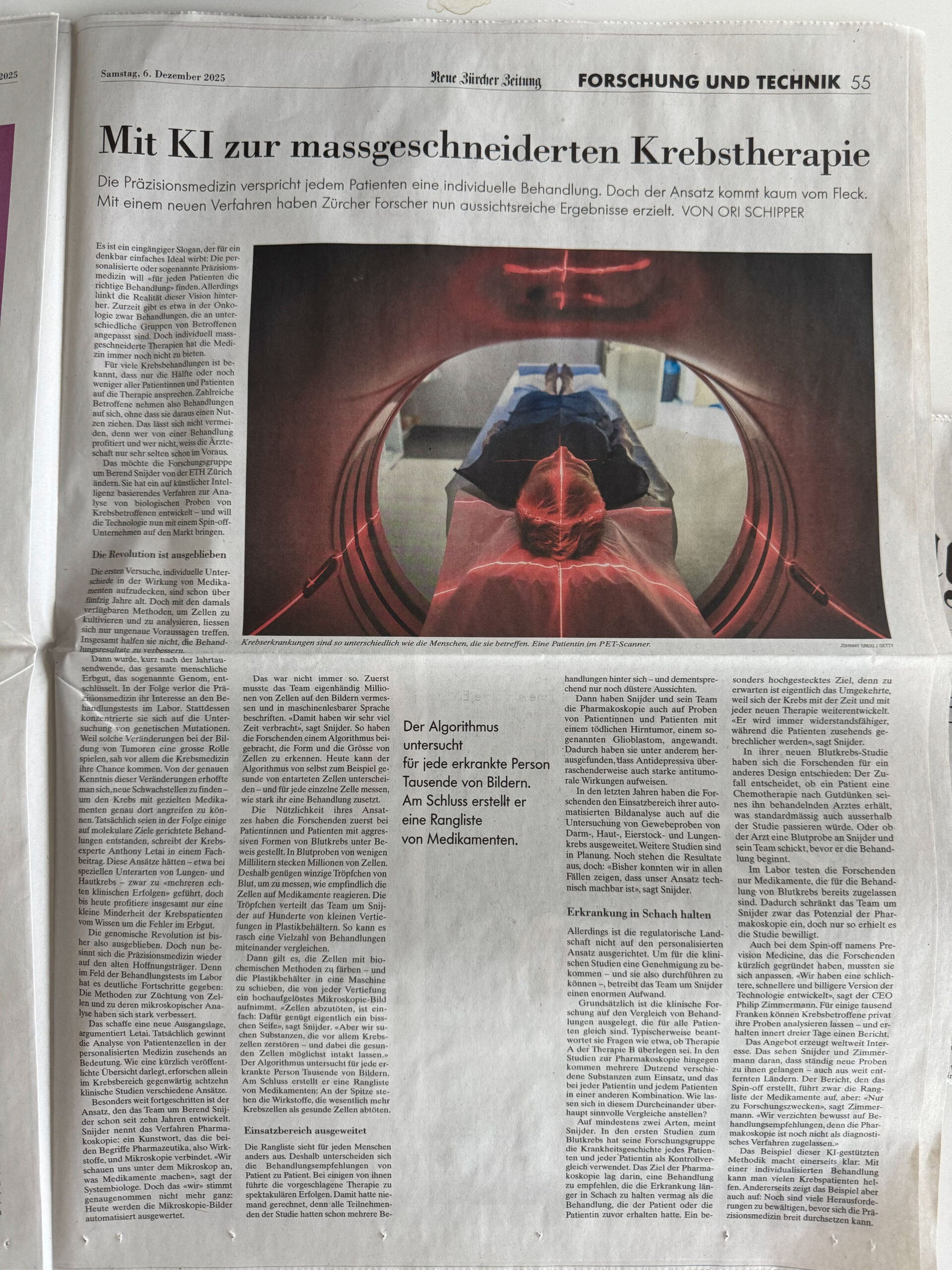 In an absolute first, a major Swiss newspaper, the Neue Zurcher Zeitung, just published a full-page article on the history of Pharmacoscopy, the Snijder lab, and it’s spin-off, Prevision Medicine. The article, written by Ori Schipper, is easily the most accessible explanation of pharmacoscopy to date (🇩🇪).